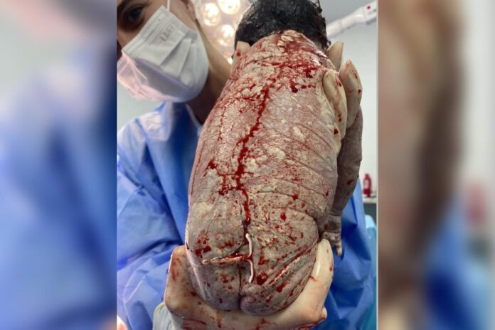 A foto, publicada no Instagram pela ginecologista e obstetra Rafaela Frota, mostra o recém-nascido com o dispositivo intrauterino (DIU) colado ao corpo logo após o parto.