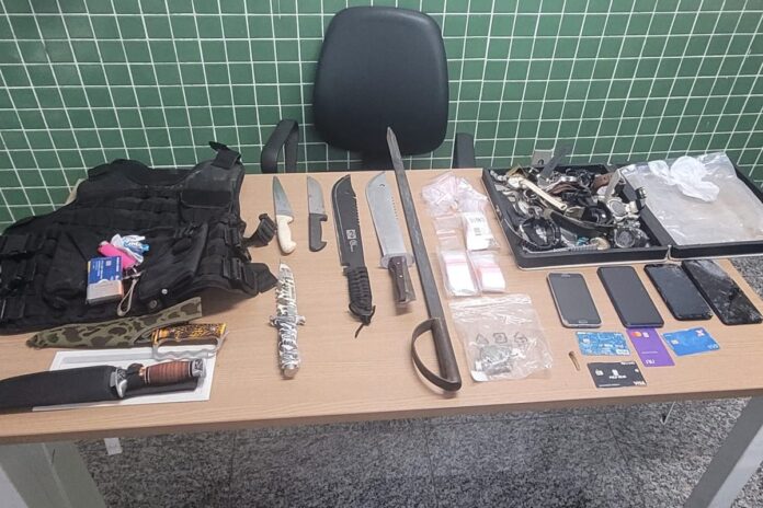 A PMDF foi acionada e ao chegar no local flagrou os envolvidos. Com eles, foram encontrados três celulares de “origem suspeita”, uma espada, um punhal, quatro facas de cozinha, três porções de cocaína e uma porção de maconha. Veja as imagens: