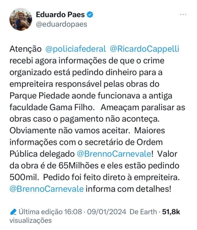 “Recebi agora informações de que o crime organizado está pedindo dinheiro para a empreiteira responsável pelas obras do Parque Piedade aonde funcionava a antiga faculdade Gama Filho”, escreveu Paes, citando os perfis da Polícia Federal e do ministro Ricardo Cappelli.