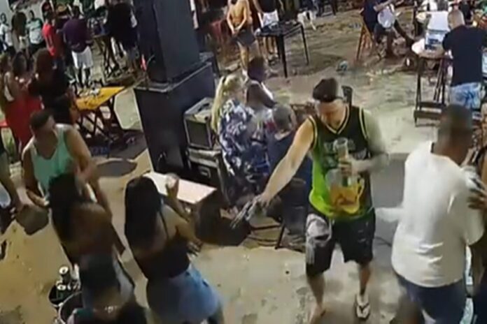 Em um vídeo, é possível ver quando um homem se aproxima carregando um revólver em uma mão e um copo de cerveja em outra. À sangue frio, ele caminha na direção da vítima e atira contra o homem.