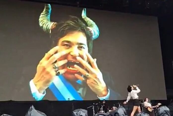 A banda Dum Chica, de Buenos Aires, causou polêmica no Lollapalooza Argentina, nesse sábado (23/3), ao projetar no telão do palco imagem de Javier Milei com presas, chifres de cabra e boca ensanguentada.