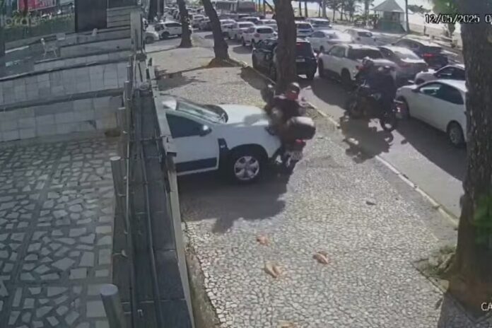 O acidente aconteceu quando um motociclista que estava com uma mulher na garupa subiu com o veículo em uma calçada para driblar o trânsito e atingiu um carro que estava saindo da garagem de um edifício. A colisão foi registrada por câmeras de segurança do prédio por volta das 8h.
