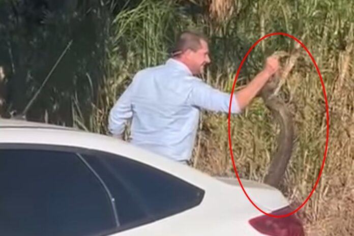 Nas imagens, uma pessoa usa um galho para atrair a atenção da cobra, que estava no meio da rua. Em seguida, o prefeito segura o animal e o leva para uma área de mata.